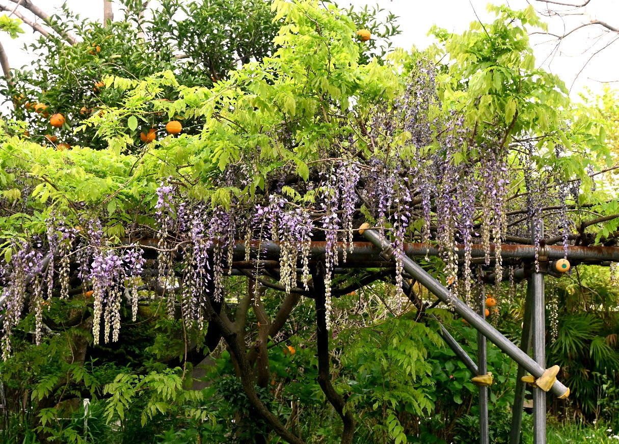 正面にある、フジの花目立っています。木は古くなってきましたがまだまだ頑張っています。